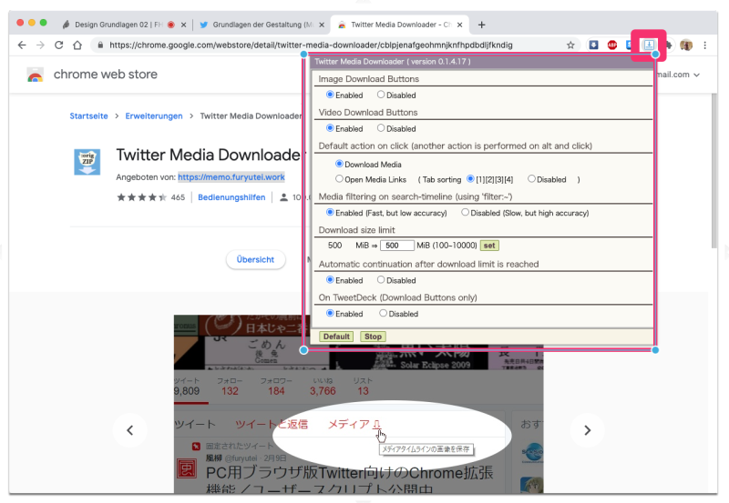 - Benutzen Sie den Chrome Browser und installieren Sie aus dem https://chrome.google.com/webstore/Chrome Webstore den Twitter Media Downloader. Diesen können Sie nun als Erweiterung (add-on) installieren (⇒Add to Chrome ⇒Add extension). Nach der Installation taucht ein kleines Icon in der Chrome Browserleiste auf. Siehe unterer Screenshot.