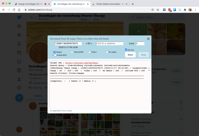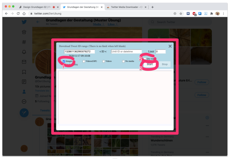 Die Studierenden des Kurses Grundlagen der Gestaltung I. waren gefragt pro Person 350 Fotos von Blattstrukturen zu machen und diese unter dem Twitter Account @derubung (https://twitter.com/DerUbung) zu posten. Während der zweiwöchigen Bearbeitungszeit sollten so etwa 10.000 Bilder zusammen kommen. Folgende Anleitung beschreibt eine einfache Lösung wie alle geposteten Bilder auf einmal herunter geladen werden können.